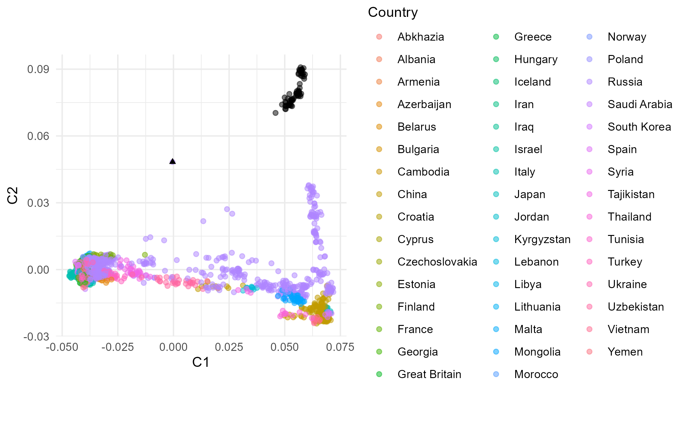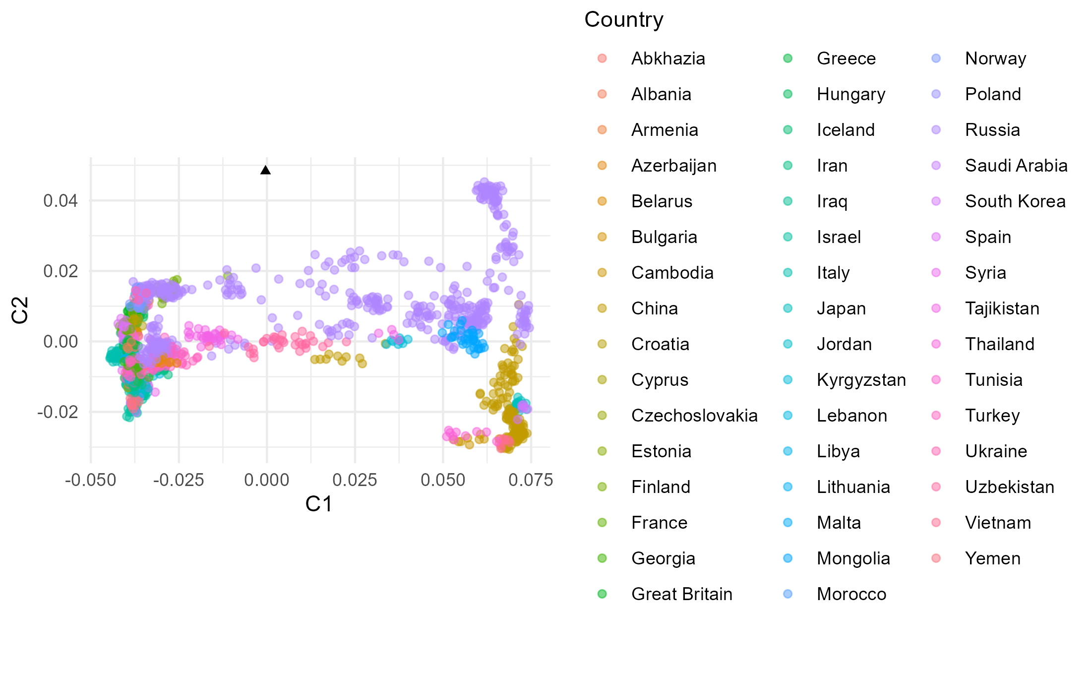 aes(x=C1, y=C2, col=Country),