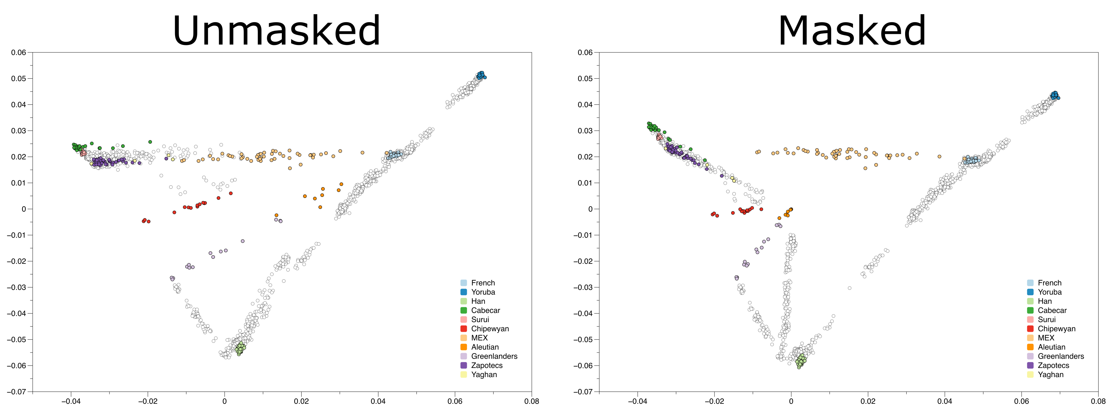 Below is a plot of the results of PCA on a dataset of differnt worldwide populations (Reich et al. 2012). In an attempt to limit the effects of colonial admixture on the studied Native American populations, the authors masked parts of the genomes of Native Americans that matched the European or African populations in their dataset, replacing those genotypes with missing data.