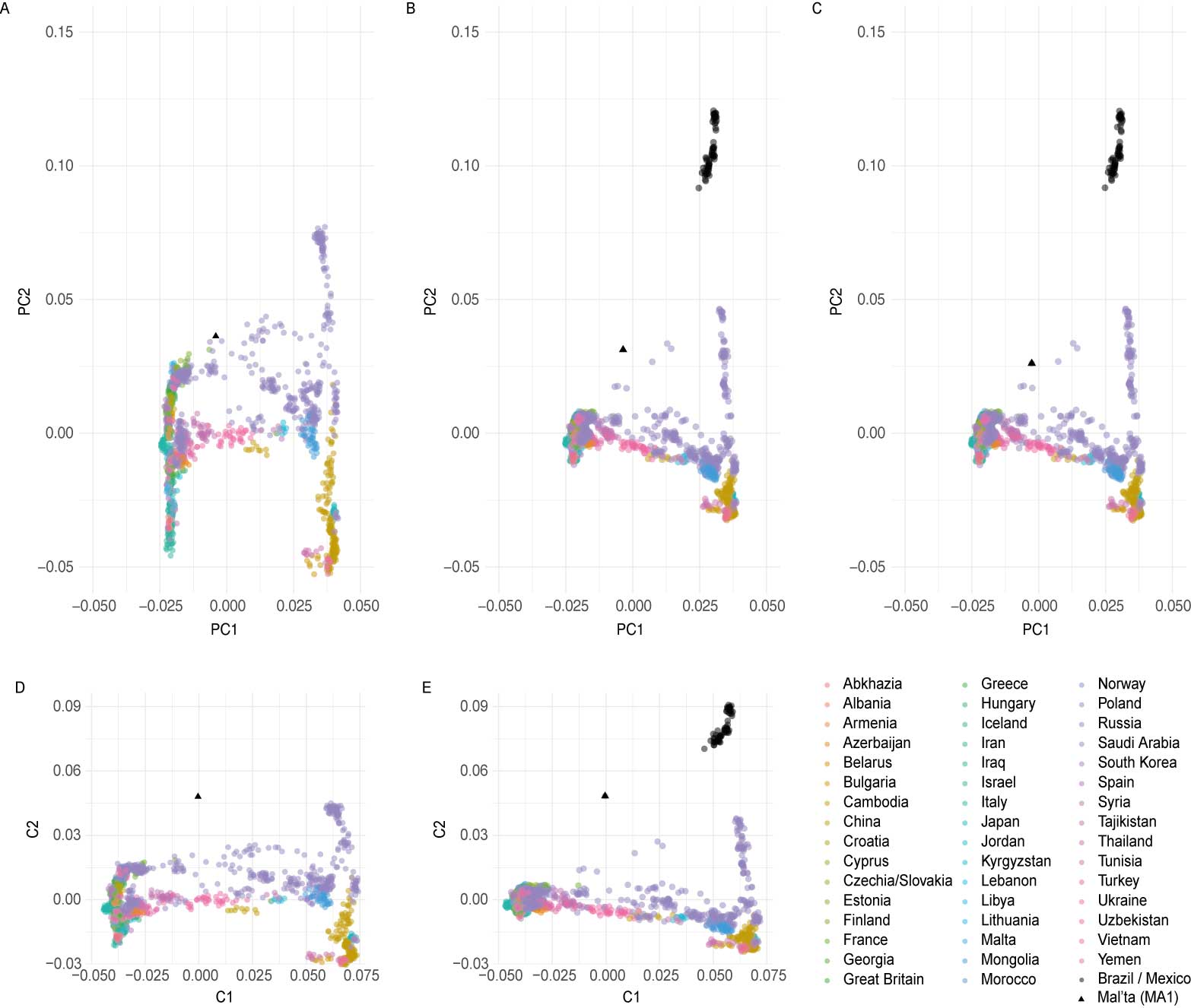 - PCA estimated using modern Eurasian and Native American genomic data with Mal’ta projected (“PCA_poplist2”)