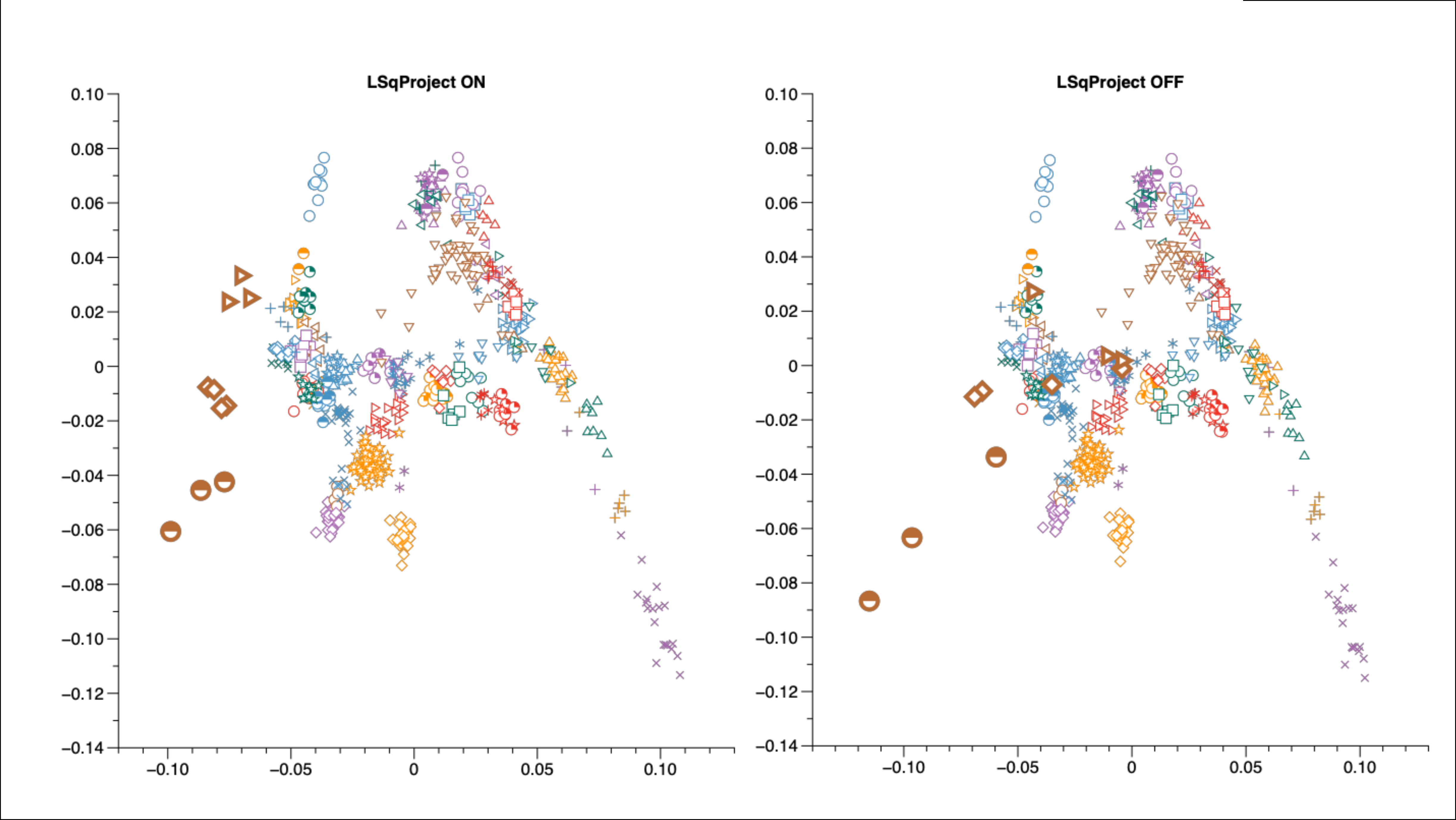 - First, comparing the placement of Eastern European hunter-gatherers (brown right-facing triangles) between the two plots, you can see that projecting these individuals does indeed provide results that are not affected by mean imputation, and thus are not shifted towards the origin.