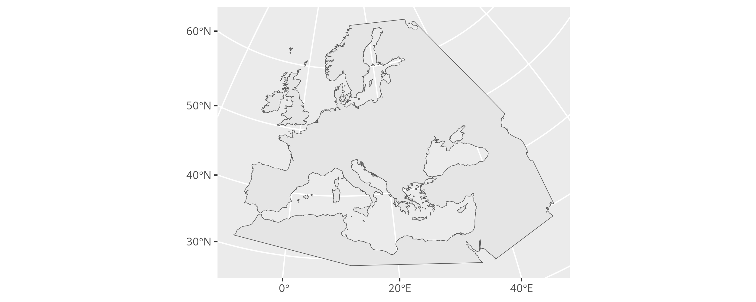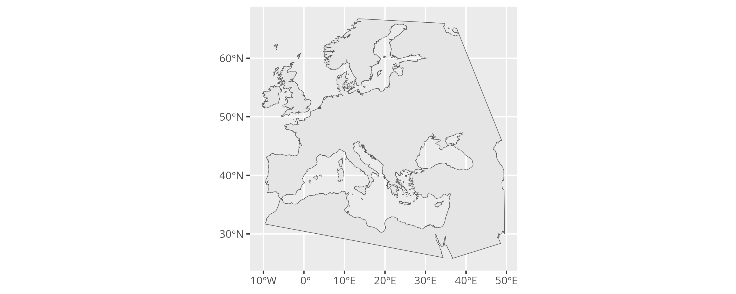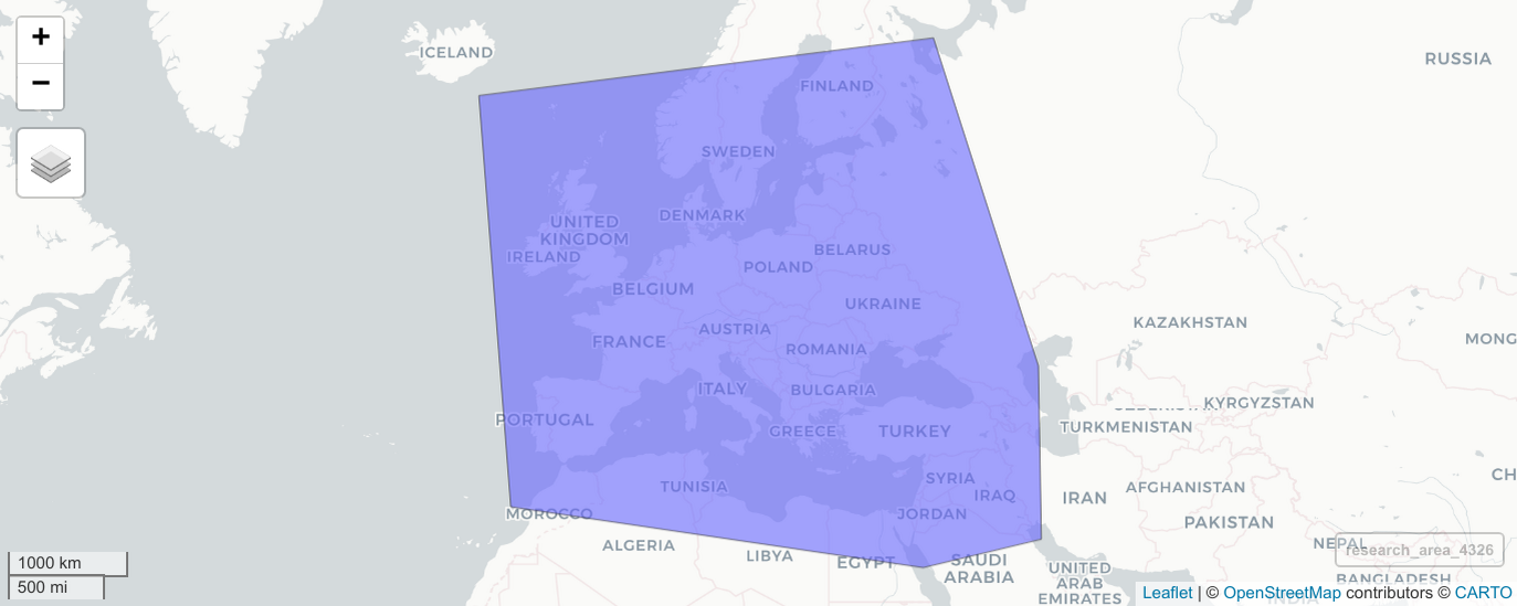 In a first step we therefore have to define the research area for our analysis as a polygon in space. One way of doing so is to provide a list of latitude and longitude coordinates (extracted e.g. from Google Maps). The following code defines a simple research area covering large parts of Western Eurasia.