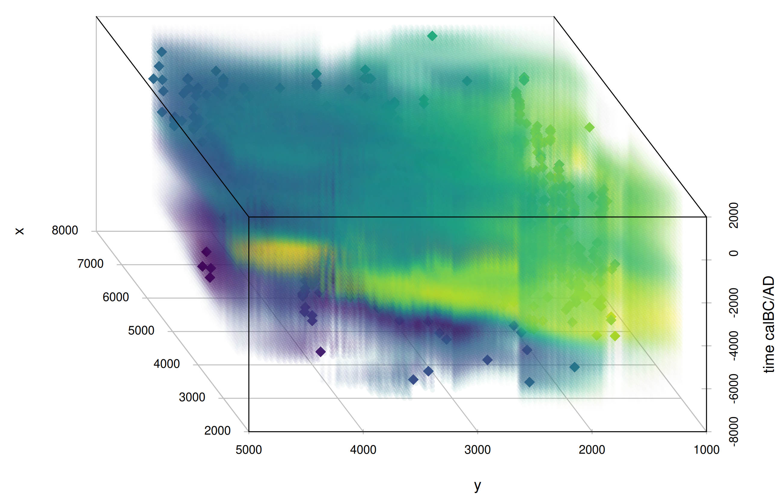 The package then provides functions to perform spatiotemporal interpolation using Gaussian process regression (GPR, “kriging”) with the laGP R package (Gramacy (2016)) to reconstruct an ancestry field based on the ancestry measure you provided.