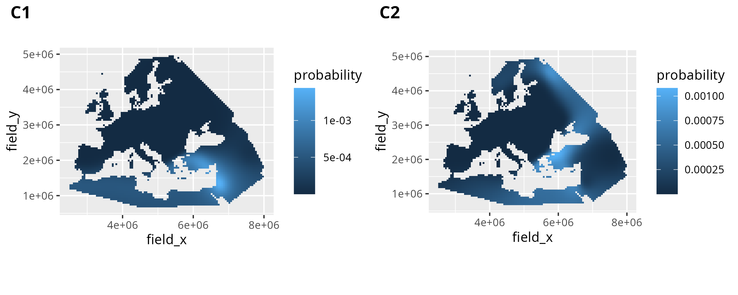 dplyr::filter(dependent_var_id == "C1")And this is then easy to plot with geom_raster(). We can then plot C1 and C2 together using cowplot::plot_grid().