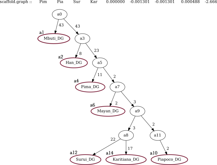 qpGraph -p parfile_qpGraph.sh -g scaffold.graph -o scaffold.graph.ggg -d scaffold.graph.dot > scaffold.graph.outWhere -p add the path to the parameter file, -g add the path for your graph file (the one prepared above), -o refers to the output file (.ggg), -d will be the dot file (to visualise the produced tree) and finally, .out file is the combined output file ❗ Keep the naming consistent for each run ❗