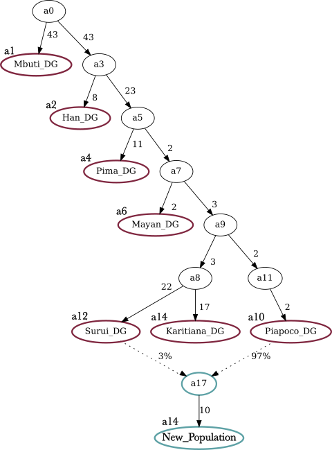 - Drift lengths (in units of Fst multiplied by 1000) and admixture proportions (as percentages from each group) in the case where an admixture edge has been set.