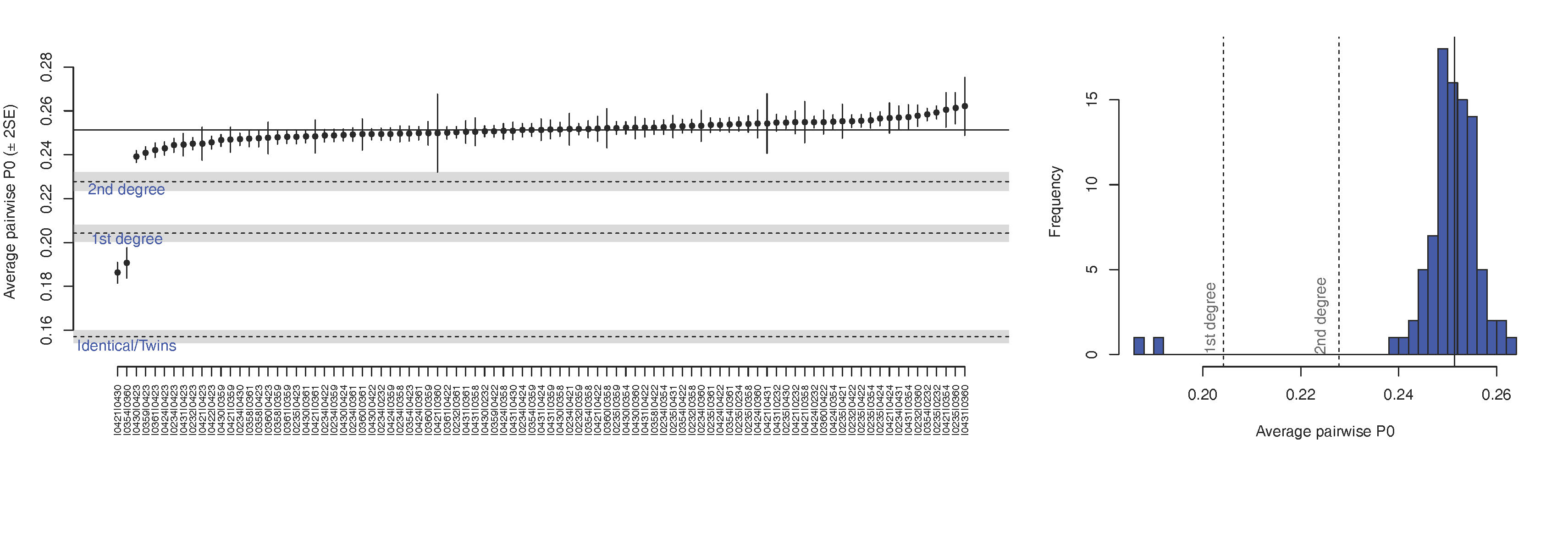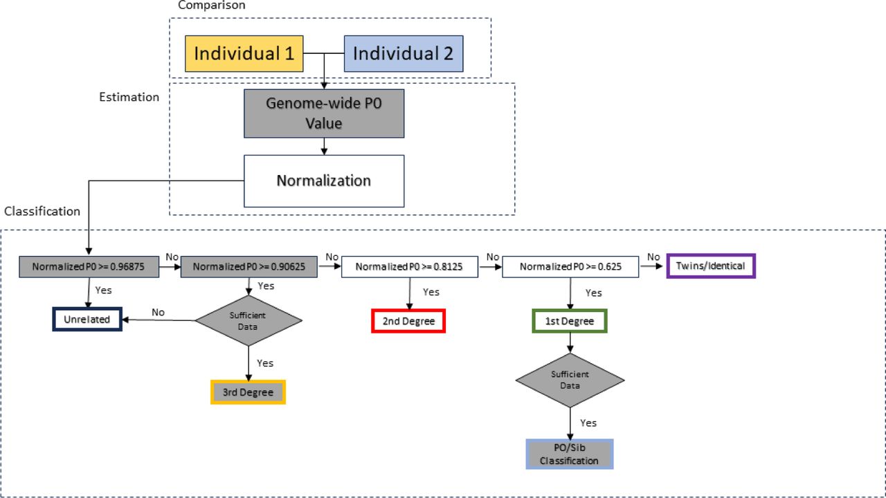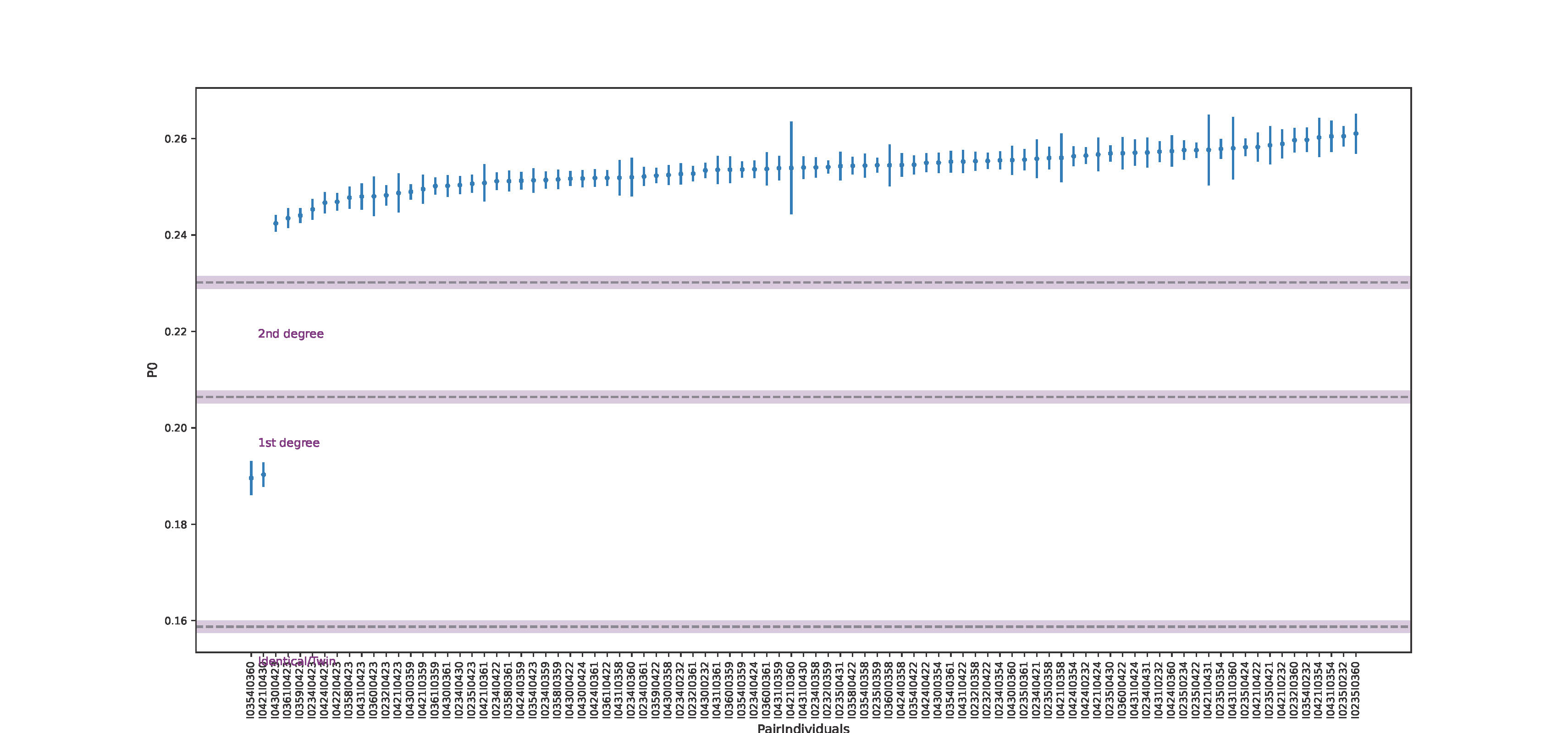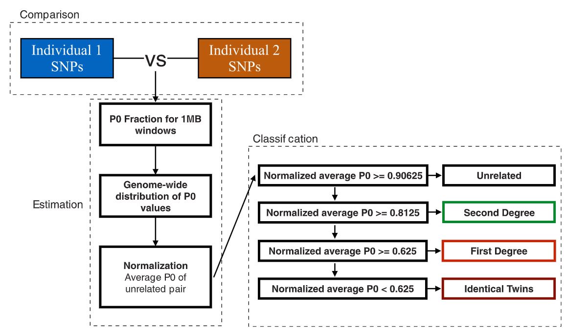 This value is estimated by calculation of the median of all average pairwise P0 per window across all pairs of individuals, which, under sufficient sample size, can be treated as a proxy for an expected P0 in a pair of unrelated individuals. Normalization can also be performed using parameters other than median, e.g., maximum observed P0 value among the pairs.Classification of each pair of individuals as unrelated, second-degree (i.e. nephew/niece-uncle/aunt, grandparent-grand- child or half-siblings), first-degree (parent-offspring or siblings) or identical individuals/identical twins from the average across the per-window proportions of non-matching alleles (P0).