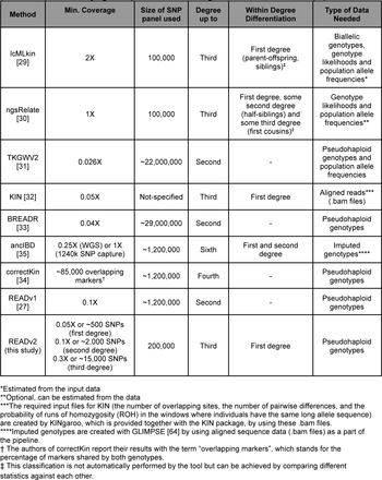READv2 is very similar in its approach to BREADR (Rohrlach et al. 2023) and TKGWV2 (Fernandes et al. 2021), with each tool having its own unique features. READv2 has the functionality to separate the different first-degree relationships, BREADR has a better quantification of uncertainty, and TKGWV2 works well with lower amounts of input data.
