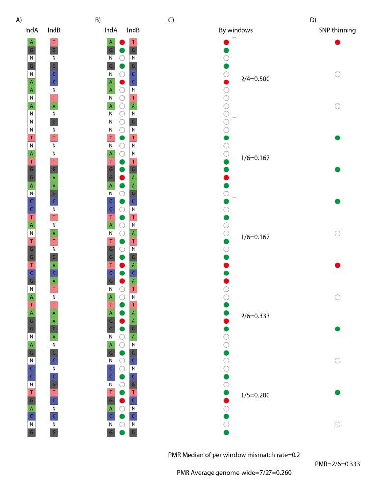 Pairwise mismatch rate (PMR) was introduced by (Kennett et al. 2017) as a means to estimate relatedness between ancient individuals (Figure 1). For each pair of individuals they computed the average mismatch rate across all autosomal SNPs covered by at least one sequence read for both of the two compared individuals (when >1 sequence read was present for one individual at a given site, a random read was sampled for the analysis) and computed standard errors using a weighted block jackknife. Mismatch rates significantly lower (Z>3) than the highest observed value, provided putative evidence of relatedness.