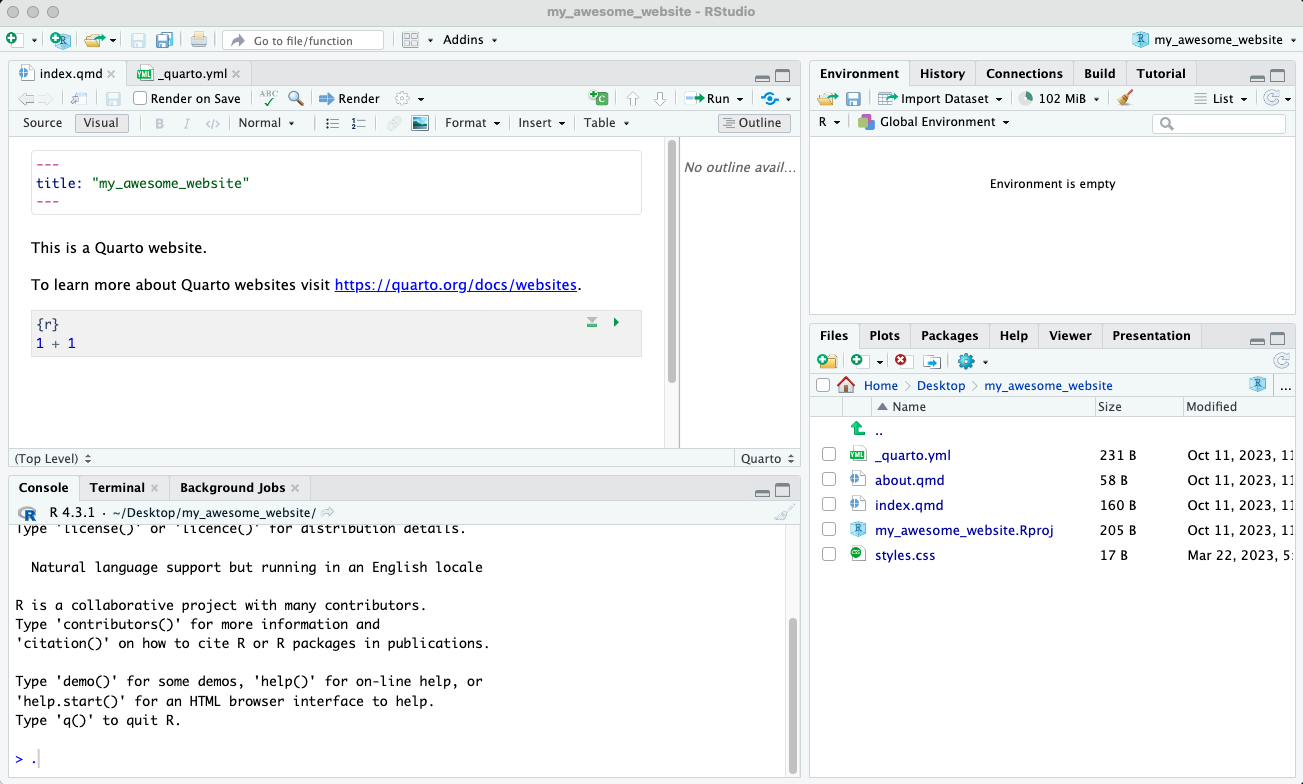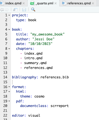 Quarto will automatically provide you with two .qmd files, as well as a .yml file.