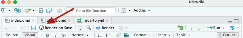 Important: Do not mistake “save” with “render”. Just by saving, your document did not get rendered automatically, unless you tick the box “Render on Save”. You have to tick that box on each .qmd file individually though.