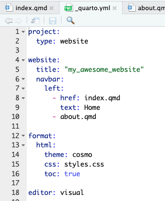 While your .qmd files contain information about one page, the .yml file defines the overall looks of the website.