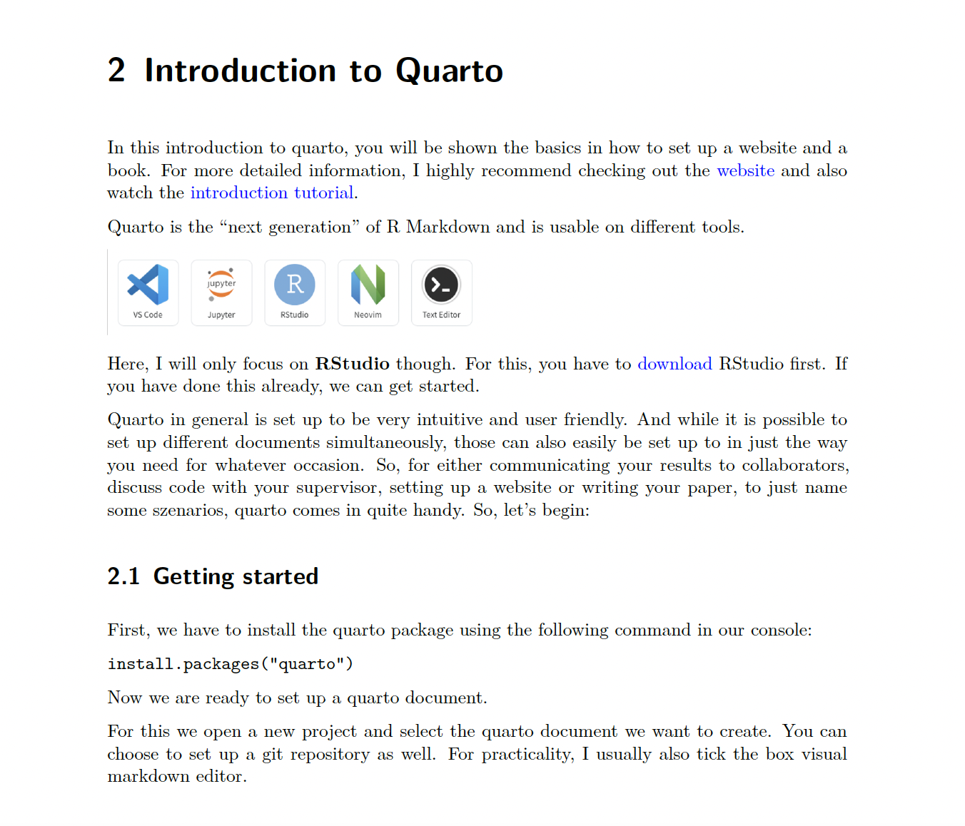 Quarto in general is set up to be very intuitive and user friendly. And while it is possible to set up different documents simultaneously, those can also easily be set up to in just the way you need for whatever occasion. So, for either communicating your results to collaborators, discuss code with your supervisor, setting up a website or writing your paper, to just name some scenarios, quarto comes in quite handy. So, let’s begin: