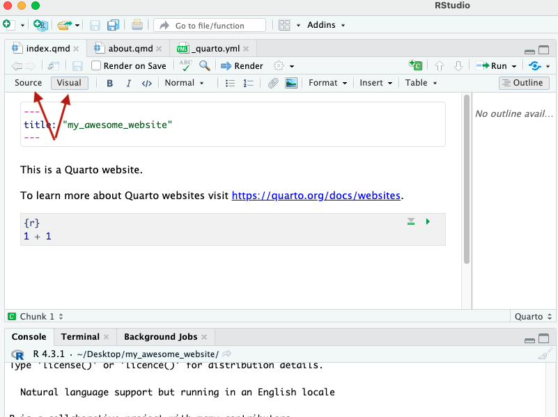 If you have chosen the Visual option on your toolbar, the preview will mostly resemble your .qmd files. If you are more comfortable with the R markdown optics, you can switch to Source.