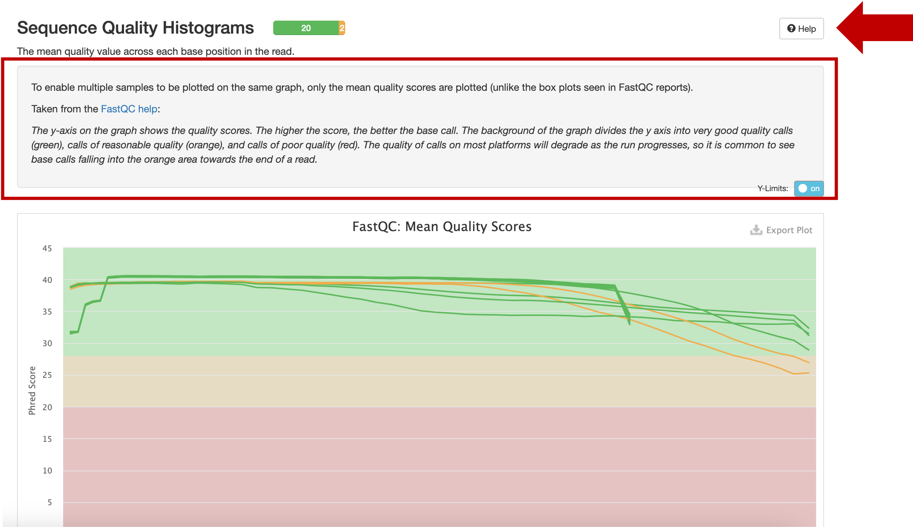 In the interest of conciseness, I will not go through every plot individually to explain what it does, because that is something that the MultiQC report can do. Just click the tiny “Help” button, and you will get a window with an explanation of what the respective statistic shows. If you need more information on a specific field, you can also dive into detail in the FastQC help.