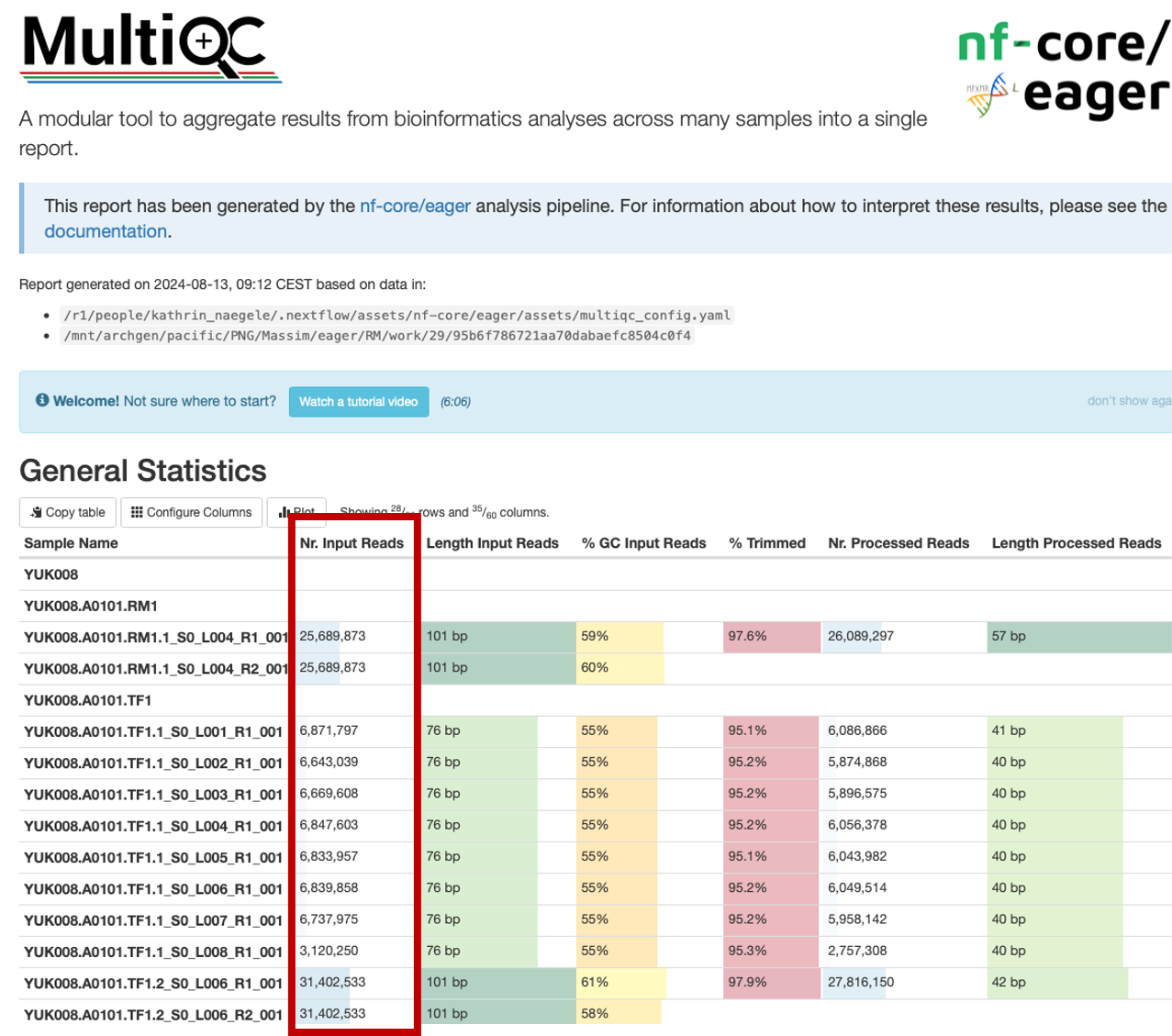 Your data has been sequenced, and you have run nf-core/eager to get the statistics. Now you can use the information to have a quick check if everything went well, and decide how to continue. First, let’s assess if everything went well in the sequencing. Runs can fail because the flow cells are faulty, expired or human mistakes were made in setting up the sequencing run. Severe problems affecting an entire run are usually already caught by the lab, but sometimes minor problems/mistakes affect single samples, and they can affect your downstream analysis/assessment of the statistics.