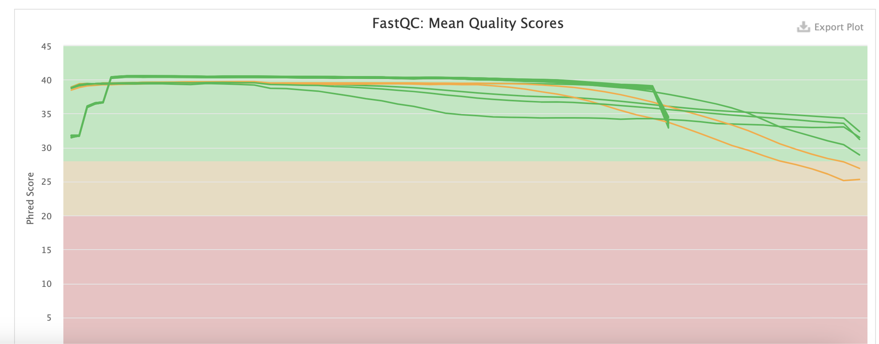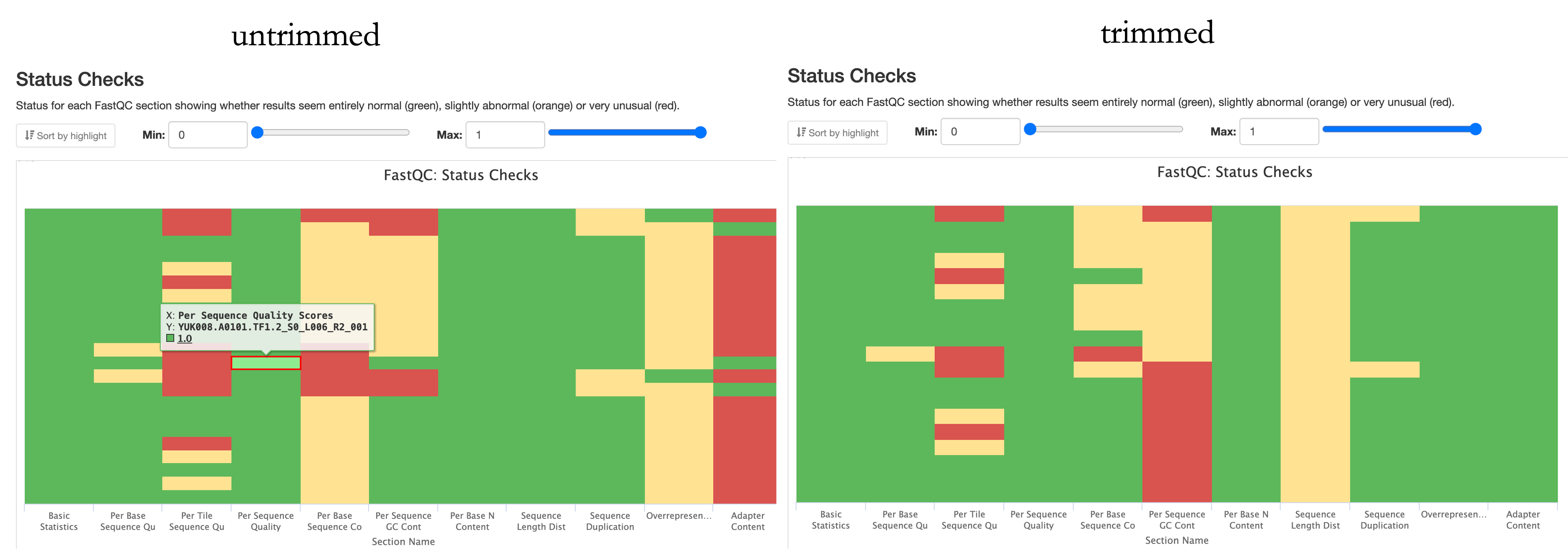 In the untrimmed summary, there are a couple of “red flags” that are expected, like over represented sequences and the adapter content (as they have not yet been removed and are therefore over represented). Should they still be flagged in the “trimmed” summary, one should investigate further.