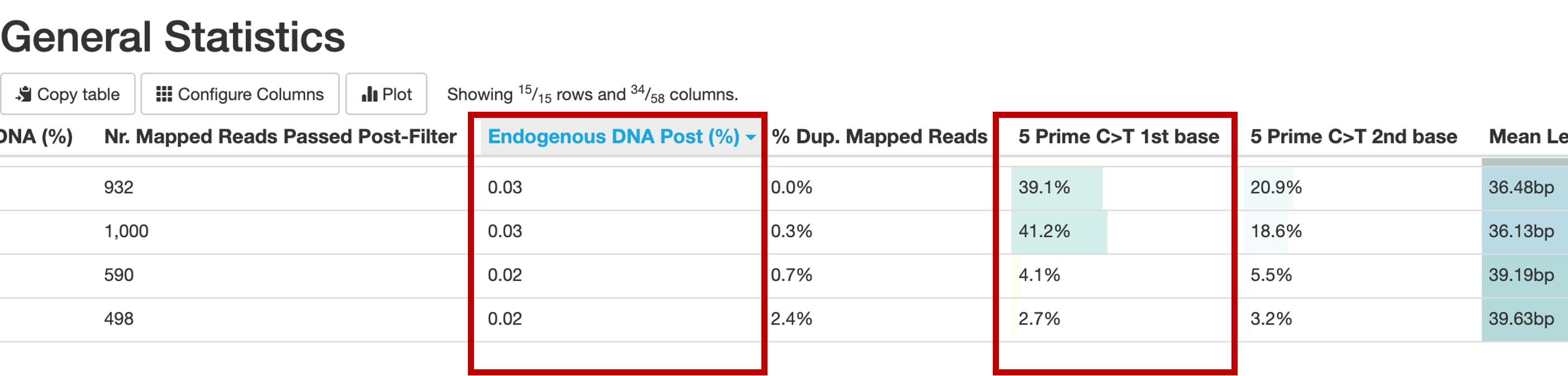 Now we know that our library has damage, but does it have enough damaged reads of our target organism (humans?)? This is reflected in the % endogenous DNA, which is the percentage of mapped (to the target reference genome) reads over the total reads that went into the mapping. As the nf-core/eager documentation so nicely puts it “Assuming a perfect ancient sample with no modern contamination, this would be the amount of true ancient DNA in the sample…”