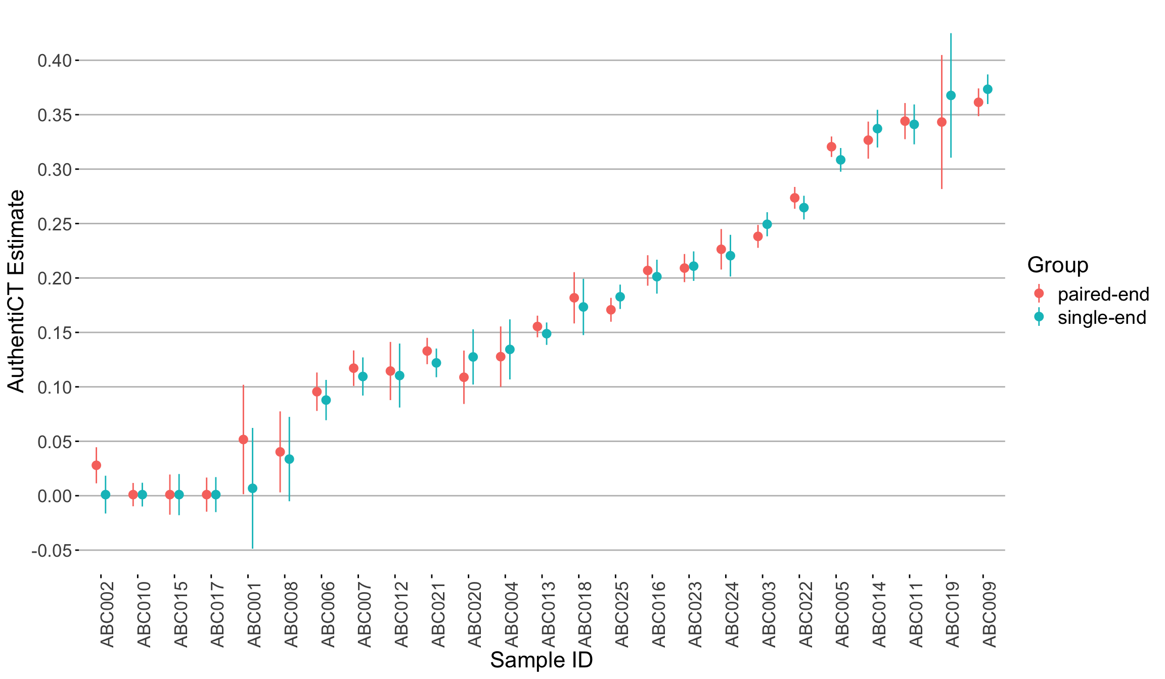 Aim and dataset: We explored AuthentiCT estimates in samples that were single-end (SE) sequenced and paired-end (PE) sequenced. The mean read length for all the samples was between 45 to 50 bp (insert size), and the sequencing read length was 75 bp in both the SE and PE setups. The adapters were trimmed using AdpaterRemoval tool.