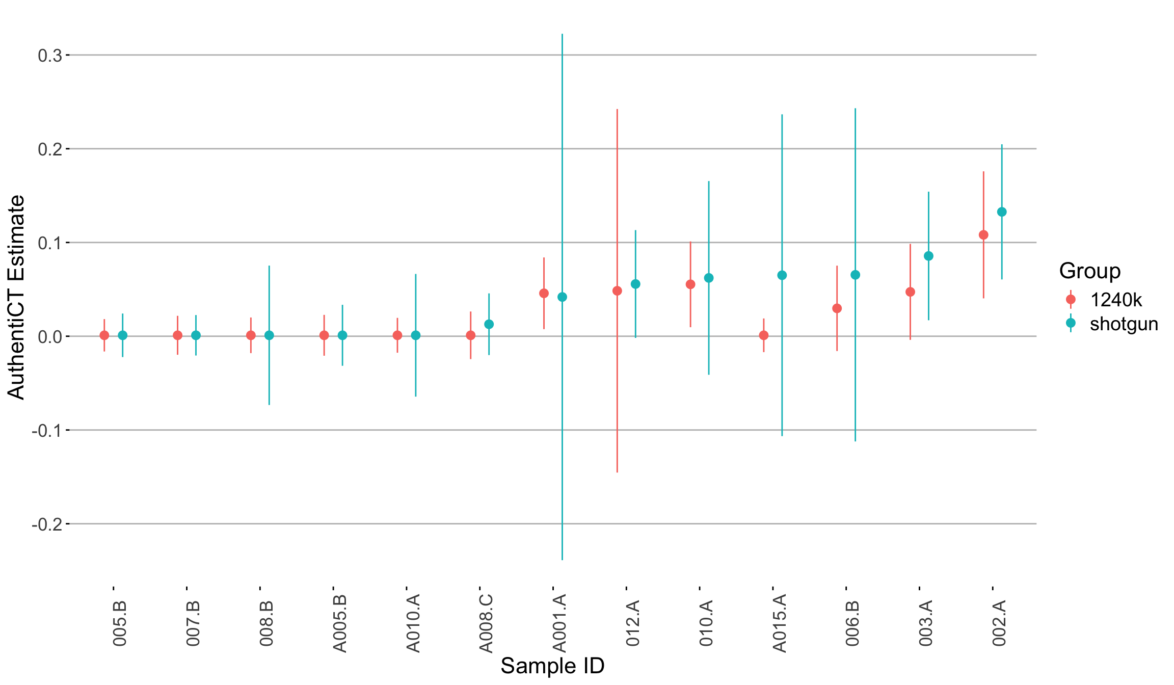 Aim: We evaluated the consistency of AuthentiCT estimates between shotgun and 1240k-captured data derived from the same samples.