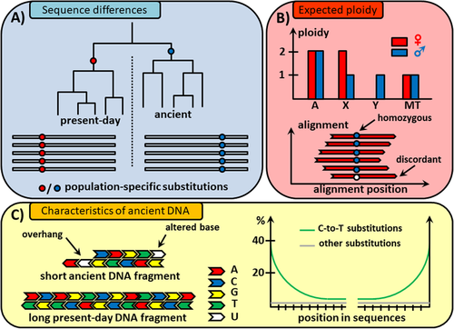 3. Ancient DNA degradation patterns: The degradation of DNA leaves characteristic patterns that can be used to distinguish aDNA sequences from those from present-day DNA contamination. The most common damage in aDNA originates from cytosine-deamination (Box C).
