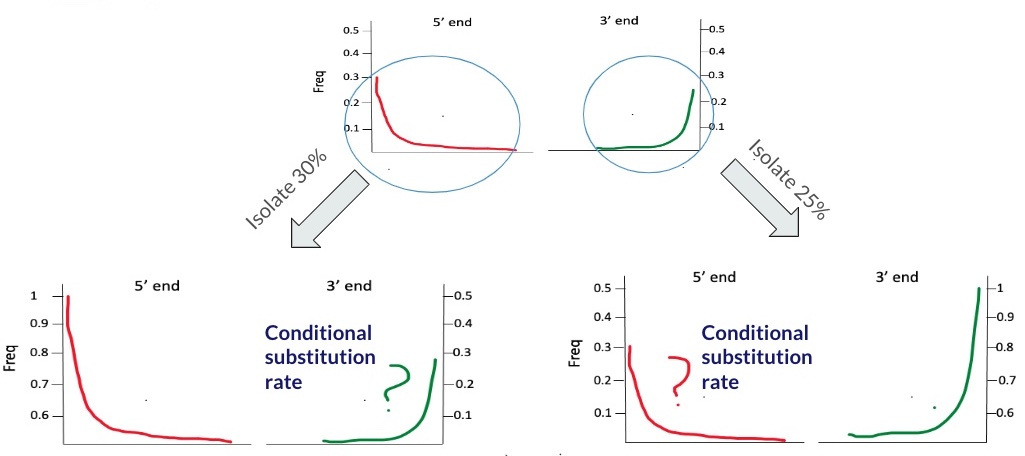 To calculate the conditional substitution rate at the 5’ end, we start by selecting only those reads that have a deamination signal at the 3’ end. hence maximizing it to a 100% rate. Similarly, to find the substitution rate at the 3’ end, we pick out reads that show a deamination signal at the 5’ end, aiming for the same 100% rate. The process is depicted in the figure below.