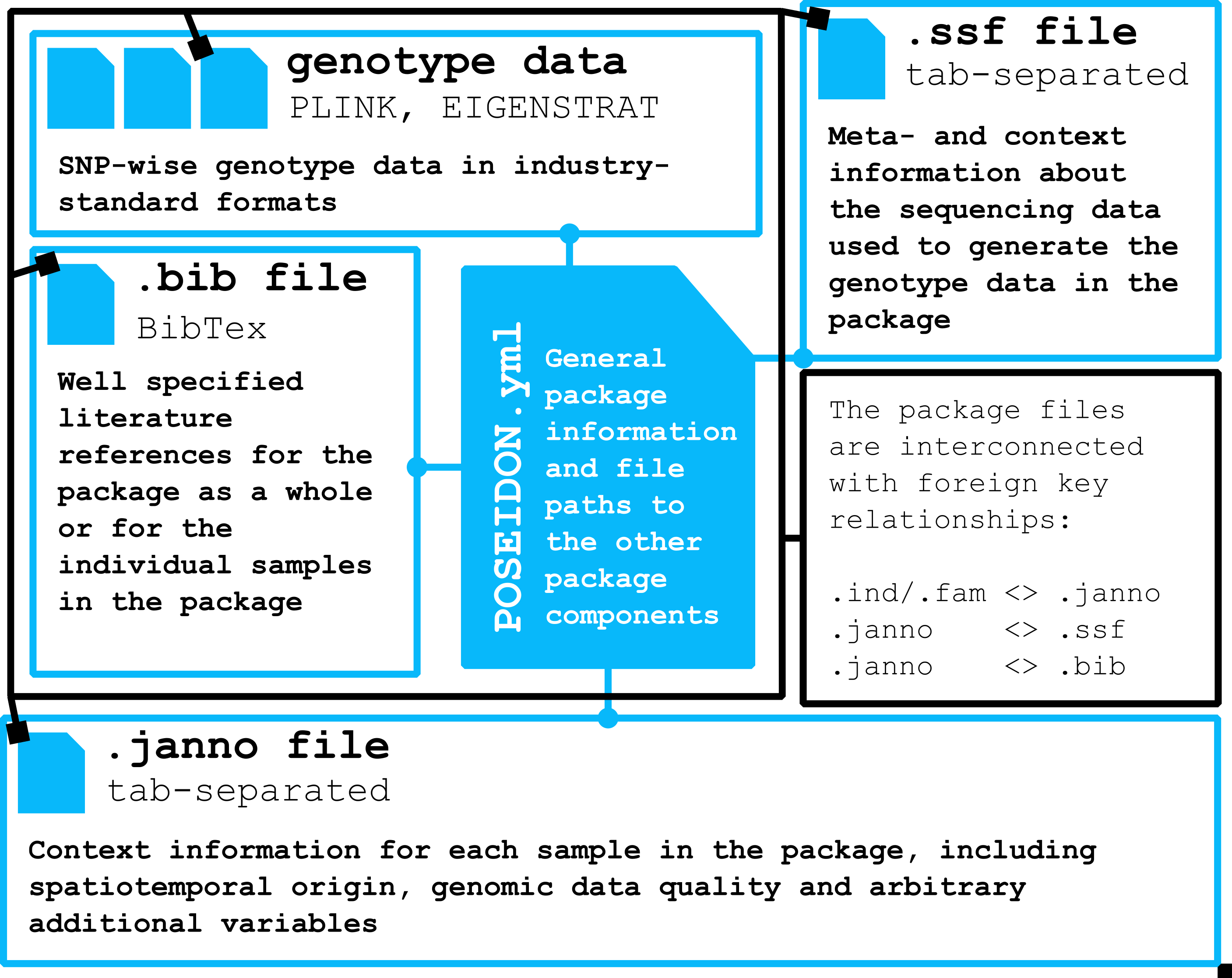 A Poseidon package bundles genotype data in EIGENSTRAT/PLINK format with human- and machine-readable meta-data.