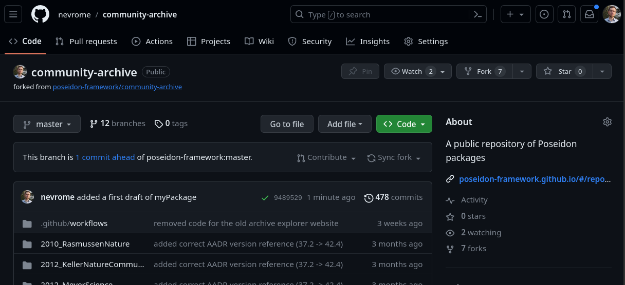 cp -r ../myPackage myPackage git add myPackage git commit -m "added a first draft of myPackage" git pushIn a last step we can open a Pull Request on GitHub from our fork to the original archive repository. Poseidon core members will take it from here.