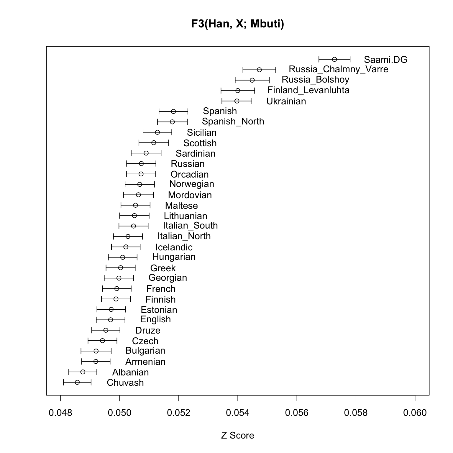 We can use this statistic to measure for example the genetic affinity to East Asia, by performing the statistic F3(Han, X; Mbuti), where Mbuti is a distant African population and acts as outgroup here, Han denote Han Chinese, and X denotes various European populations that we want to test.